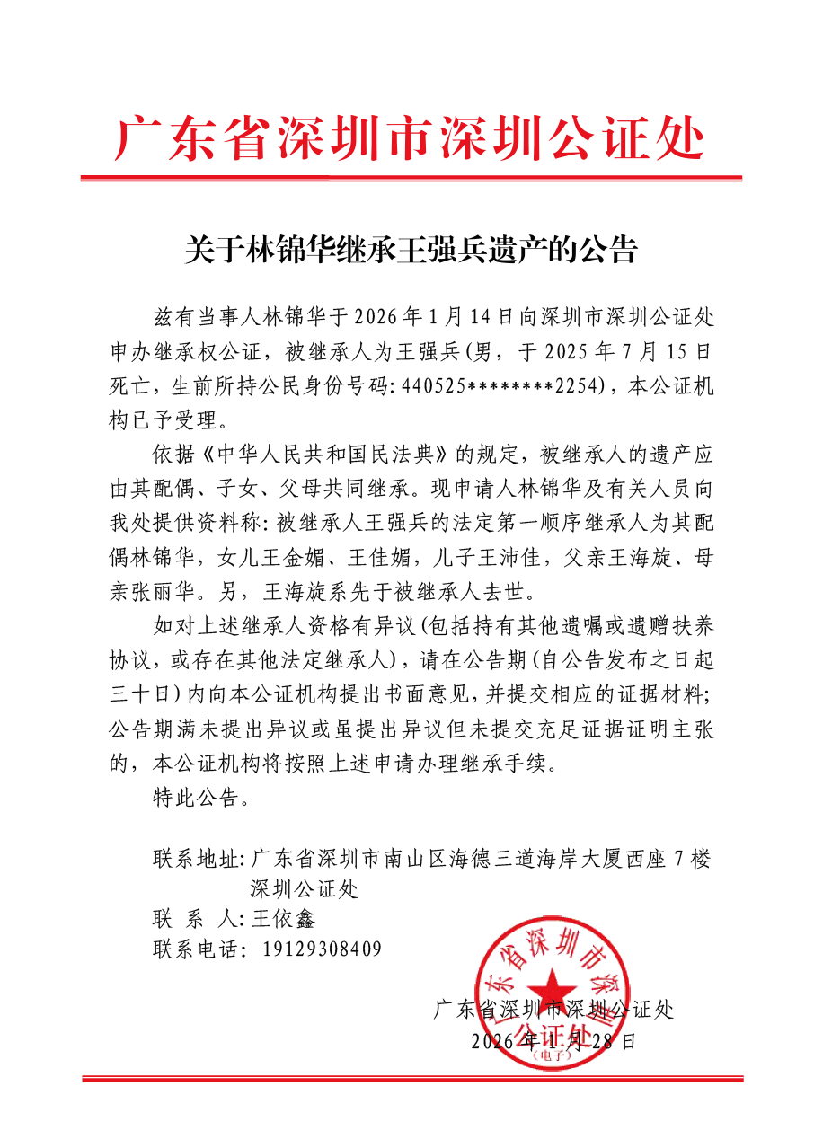 关于林锦华继承王强兵遗产的公告