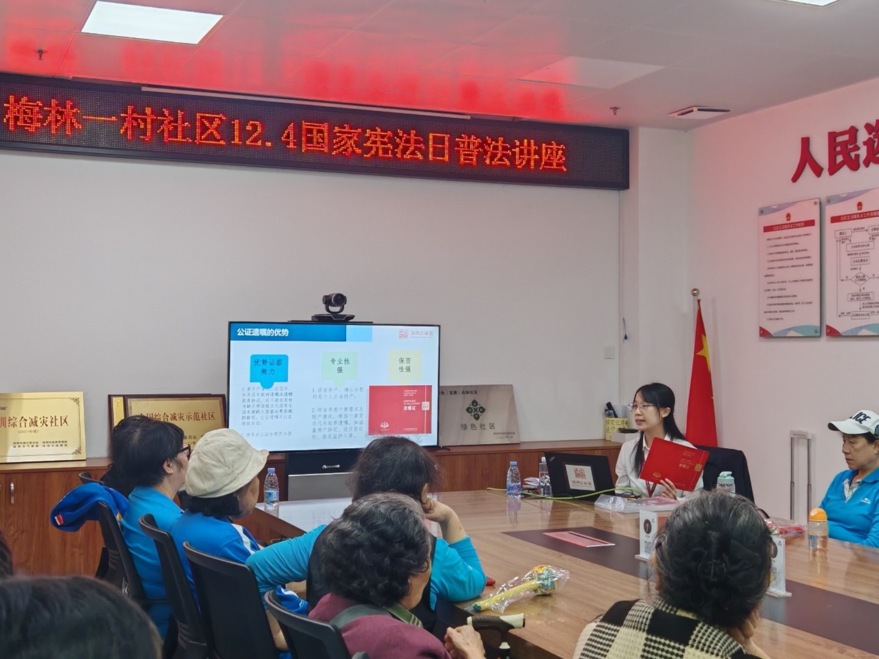 12月4日,深圳公证处天平办证点在梅林一村社区居委会开展了一场主题为“公证守护家的未来,从财产传承到人身照护”的普法宣讲活动。讲解了意定监护、生前预嘱公证以及夫妻财产协议等财富传承类公证业务,让群众了解到,公证既能提前规划好未来的人身照护,守住个人自主决定权,又能为家庭财产传承等问题做好周全安排,守护好生命尊严与家庭和睦。